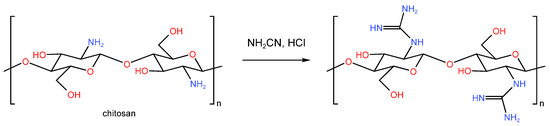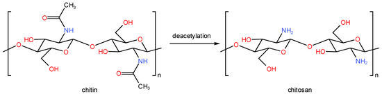 Chitosan (CS) is a natural polysaccharide composed of 2-amino-2-deoxy-D-glucose residues connected via 1,4-glycosidic bonds, which is obtained by deacetylation of chitin (Figure 1)—the main component of the exoskeleton of crustaceans, insects and the cell walls of fungi [1,2,3].