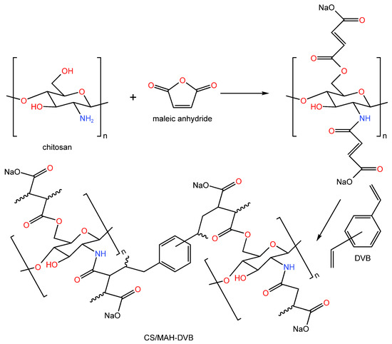 In awork by Liu et al. [97], divinylbenzene (DVB) was selected as a crosslinking agent in a two-step, one pot method based on the acylation reaction between maleic anhydride and CS to prepare a series of DVB-crosslinked CS/maleic anhydride (MAH) polymers (CS/MAH–DVB), which wasused to remove methylene blue (MB) from aqueous solutions. A simplifiedCS/MAH-DVB synthesis scheme is presented in Figure 10. Briefly, CS reacted with MAH in formamide medium in the presence of p-toluene sulfonic acid. Then, the modified CS reacted with DVB (vinyl groups were taken equimolar to MAH) in DMSO medium in the presence of 2,2′-azobisisobutyronitrile. As a result, three samples of CS/MAH–DVB polymers were prepared using 0.5, 1 and 2CS/MAH molar ratios.