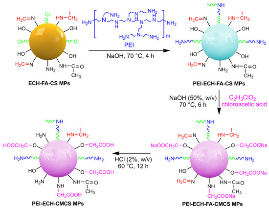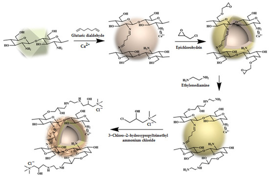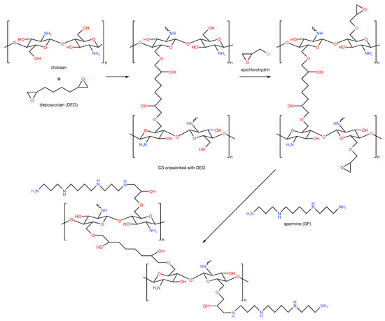 DEO-crosslinked CS beads modified with spermine (SP) were synthesized (Figure 12) [100]. SP was chosen as an amination agent for the enhanced adsorption of Cr(VI) from aqueous solutions. As can be seen from Figure 12, DEO can interact with either –CH2OH or –NH2 groups of CS; thus, free –CH2OH groups can further interact with ECH and then with SP. Optimal CS–DEO–SP beads were prepared using 1.5 mg/L of SP for 5 h at 50 °C. The prepared beads exhibited heterogeneous and porous surfaces. The obtained CS–DEO–SP beads were macroporous and had increased surface area, pore volume and pore size by 4.9, 7.1 and 1.4 times, respectively, in comparison with initial CS beads. The experimental data revealed that the adsorption of Cr(VI) ions on the CS–DEO–SP beads was extremely dependent on the solution’s pH level. A maximum adsorption capacity of 352 mg/g was found at acidic condition (pH 2.0). Regeneration of CS–DEO–SP was successfully performed via treatment with NaOH solution (1.0 mol/L). Regenerated CS–DEO–SP beads allowed for the achievement of an adsorption capacity of 192.31 mg/g after five cycles of repeated use. Thus, high adsorption capacity, acid stability and reusability render the CS–DEO–SP beads a promising and effective adsorbent for eliminating Cr(VI) from metal plating wastewater.