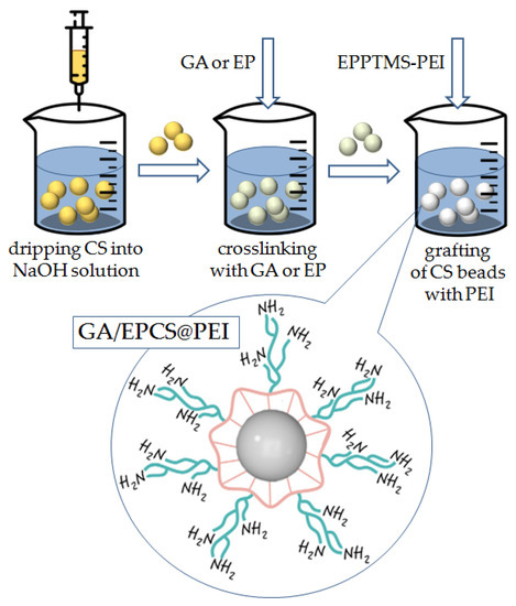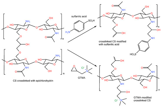 CS is known to be an environment-friendly and cost-efficient adsorbent for dyes and inorganic ions from wastewater. However, CS has some drawbacks, including dissolution in anacidic environment and poor mechanical properties, resulting in unsatisfactory adsorption performances. Crosslinking allows for the enhancement of the mechanical properties and pH-stability of CS. At the same time, the grafting of CS with functional groups is an effective way ofimproving its adsorption performance [97].