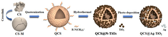 - Wang, A.; Zhu, Q.; Xing, Z. Multifunctional QuaternizedChitosan@surface Plasmon Resonance Ag/N-TiO2 Core-Shell Microsphere for Synergistic Adsorption-Photothermal Catalysis Degradation of Low-Temperature Wastewater and Bacteriostasis under visible light. Chem. Eng. J. 2020, 393, 124781. [Google Scholar] [CrossRef]