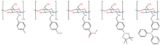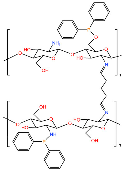 The formation of Schiff’s bases is widely used in the modification of amines, allowing for better complexation with metal ions. Recently, Suresh et al. [37] synthesized Schiff’s base of carboxymethyl CS/p-dimethylaminobenzaldehyde (Figure 3b) for complexation with Co, Ni and Zn for further biomedical application. Moreover, the obtained Zn complexes were shown to reveal promising catalytic properties in the oxidation of cyclohexane to cyclohexanol, allowing >70% of cyclohexanol yield for 12 h.