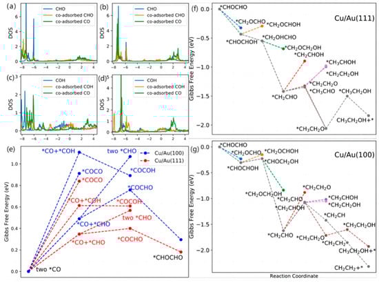DOS of *C atoms of adsorption of intermediates on (a,c) Cu/Au(111) and (b,d) Cu/Au(100) and (e) Gibbs free energy diagrams for C-C coupling. The energies are provided relative to two *CO molecules vs. RHE. Gibbs free energy diagrams of the reaction of the reduction of *CHOCHO to alcohol and ethylene on (f) Cu/Au(111) and (g) Cu/Au(100) surfaces. The energies are provided relative to *CHOCHO vs. RHE, reproduced with permission from [52]. Copyright American Chemical Society, 2020.