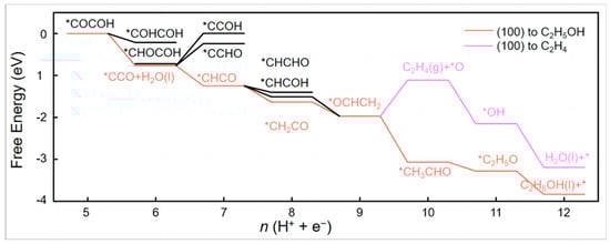 As shown in Figure 1, free energies (always in eV) excluding the effects of applied potential (at 0 V vs. RHE using the CHE) are written next to reaction arrows; those computed at −1 V using the CEP are highlighted in bold. At the same time, the solid and hollow arrows are used to represent exergonic and endergonic reactions, respectively, at 0 V vs. the RHE. The reduction pathway of CO on the Cu(100) surface is discussed and it is concluded that the surface *COCHO is critical in the generation of C2 compounds. It is also a key intermediate in determining the selectivity of the two main C2 products of the reaction, ethylene and ethanol. In Figure 1, the pathway leading to COCHOH eventually leads to ethylene.