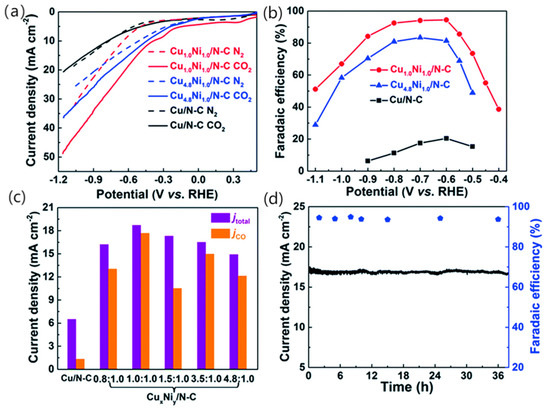 LSV curves acquired in N2-saturated (dotted line) or CO2-saturated (solid line) 0.5 M KHCO3 solution at a scan rate of 50 mV s−1 (a). CO faradaic efficiency at various potentials (b). Total current density and partial current density of different catalysts at an applied potential of −0.60 V vs. RHE (c). Stability of Cu1.0Ni1.0/N-C at a potential of −0.60 V vs. RHE during 38 h (d). Catalyst loading: 0.5 mg cm−2, reproduced with permission from [65]. Copyright The Royal Society of Chemistry, 2019.
