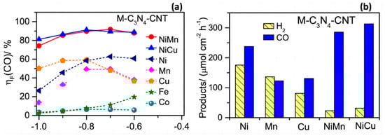 (a) The Faradic efficiency (ηF) of CO evolution at different potentials. (b) Hydrogen and CO evolution rates at −0.8 V vs. RHE on M-C3N4-CNT (M = Fe, Co, Ni, Mn, Cu, NiMn, and NiCu) catalysts in 0.5 M KHCO3 saturated with CO2, reproduced with permission from [70]. Copyright Elsevier B.V, 2019.