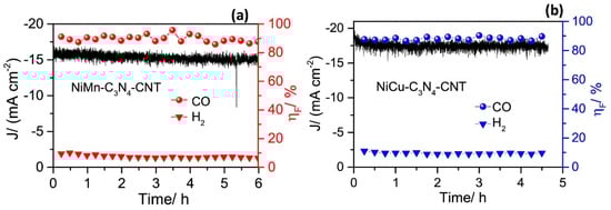 The amperometric J-t curves, and the ηF for CO and H2 evolution of (a) NiMn-C3N4-CNT, and (b) NiCu-C3N4-CNT catalysts at −0.8 V vs. RHE in 0.5 M KHCO3 saturated with CO2, reproduced with permission from [70]. Copyright Elsevier B.V, 2019.