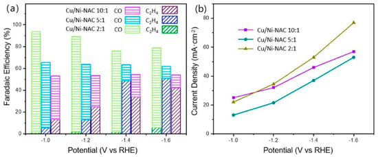 Anchoring a single atom of Ni to nitrogen-assembled carbon (Ni-NAC), the catalyst can convert CO2 to CO over a wide range of potentials and with a FE of over 90% [74,75]. In order to investigate the bicomponent effect while controlling the CO content, different ratios of CuNW and Ni-NAC (2:1, 5:1, 10:1) were prepared for analysis of the products and current densities, as shown in Figure 13a,b. Of the three samples, Cu-Ni-NAC 2:1 showed the highest CO FE, and it is thought that when the ratio of Ni-NAC is higher, it leads to a higher FE of CO. The higher the CuNW content, the higher the FE of C2H4. Considering the FE and current density of C2H4, a Cu-Ni-NAC 10:1 catalyst was considered to be optimal. This hybrid catalyst allows the final product to be selected as a C2 product, and it has excellent selectivity for C2H4.
