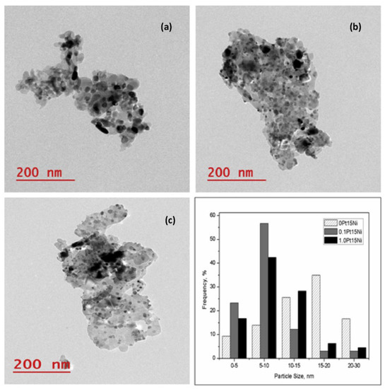 TEM images and active metal particle size distribution for (a) 0Pt15Ni, (b) 0.1Pt15Ni, and (c) 1.0Pt15Ni catalysts. Reprinted with permission from [146]. Copyright 2017, Elsevier.