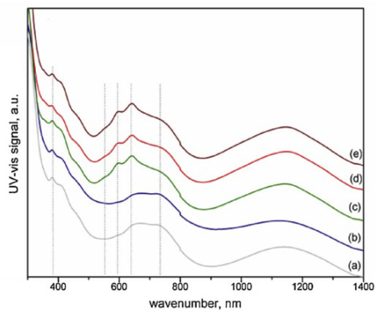 UV–vis spectroscopic patterns of (a) RhNicoimp, (b) Cat600600, (c) Cat600850, (d) Cat850600, and (e) Cat850850. Reprinted with permission from [151], copyright 2019, Elsevier.