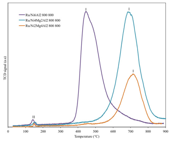 TPR profiles of Ru/NixMg6-xAl2 samples (x = 2, 4 and 6). Reprinted with permission from [159], copyright 2015, Elsevier.