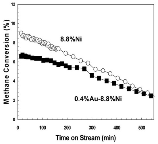 Not all noble metals promote Ni activity though. Indeed, Au-Ni/Mg(Al)O catalysts for SMR prepared by sequential impregnation revealed that the addition of a small amount of Au on Ni-based catalysts caused a decrease in H2 chemisorption and dissociative N2O adsorption, which can be mainly attributed to the effect of Au on the adsorption properties of several adjacent Ni sites [166]. Calculations showed that Au is usually located at step and edge sites, which are active sites for catalytic activity but can also serve as sites for carbon nucleation [167,168]. This study showed that the addition of 0.4 wt.% Au to 8.8 wt.% Ni/Mg(Al)O resulted in a small decrease in catalyst activity (Figure 7).