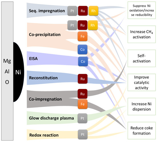 Bimetallic catalysts are a promising area of research because they have improved properties compared to their parent metals, resulting in some cases in catalysts with higher selectivity, activity, and stability. Precious metals with high reforming activity and low coking tendency have been studied as promoters for Ni-based catalysts [134,135,136,137,138,139]. Among different synthesis methods reported for CH4 reforming catalysts (i.e., self-combustion, ion exchange, sol-gel, microemulsion, precipitation, wet impregnation, and colloidal), precipitation and impregnation methods are the most common ones [140,141,142,143,144].