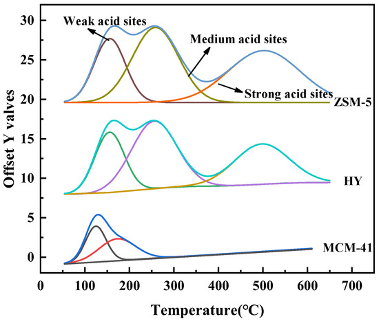 In addition, the acid distribution of the catalyst was estimated by Gaussian fitting. As presented in Table 2, HY has the highest total acid contents and a strong acid site, which were 1766 μmol/g and 652 μmol/g, respectively. The MCM-41 has the lowest total acid content (359 μmol/g). The acidity of the catalysts has a great influence on the catalytic performance of the final product of plastic pyrolysis, which is covered in detail in Section 2.4, Section 2.5 and Section 2.6.