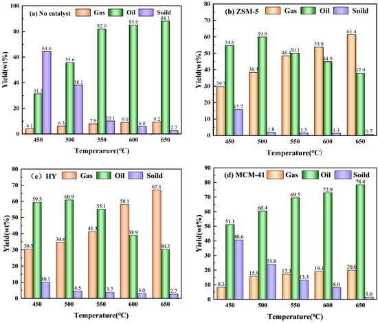 Furthermore, it can be observed that the ZSM-5 and HY catalysts resulted in much higher gas yields with increasing temperature while the MCM-41 obtained more oil yield. As seen from Figure 3b,c, there was no significant difference in gas yield between ZSM-5 and HY, both of which had higher gas yield than MCM-41. The yield of gas on the ZSM-5 catalyst increased from 29.7% to 61.4% as the temperature increased from 450 °C to 650 °C; however, the yield of oil on MCM-41 increased from 51.1% to 78.4%.