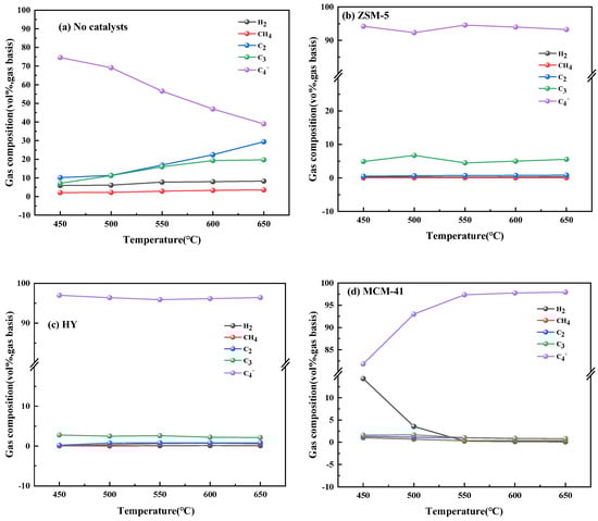 The gaseous product composition for non-catalytic and catalytic experiments from 450 °C to 650 °C are depicted in Figure 4. The pyrolysis gas consists of H2, CH4 and C2–C4+ gaseous hydrocarbon mixtures. The contents of H2, CH4, C2 and C3 increased by 2.35%, 1.45%, 19.21% and 19.72% as the temperature rose from 450 °C to 650 °C, while C4+ gas reduced by 35.59%, which was mainly due to the C4+ gaseous products being further cleaved to CH4 and other small molecule gases as temperature increased [,].