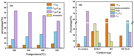 The carbon number distribution of oil is exhibited in Figure 5 and the major constituents of the oil product as well as relative content are presented in the Supplementary Material. As shown in Figure 5, in the experiment without catalysts, the oil products comprised four comparable fractions (<C11, C12–C18, C19–C30 and aromatics), indicating that the carbon number distribution was relatively uniform compared to the catalytic experiment. As the temperature increased from 500 °C to 650 °C, the yield of light hydrocarbon fractions improved and the yield of heavy hydrocarbon fractions decreased in the non-catalytic run (Figure 5a). The liquid fractions are mainly composed of linear paraffins (C10~C30) and produced almost no aromatic hydrocarbons [] (Tables S1 and S2). The pyrolysis of LDPE was the result of its characteristic long-carbon chain structure, converting the feedstock into wax rather than liquid oil [].