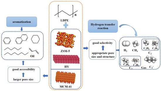 As shown in Figure 7, the scheme of catalyst participation in LPDE pyrolysis reaction pathways is proposed. When the ZSM-5 was introduced into the pyrolysis process, the smaller pore size and larger pore structure of ZSM-5 allowed the initial decomposition sample on the outer surface to diffuse into the interior of ZSM-5, favoring the recombinant fraction to further decompose into gaseous products, resulting in higher gas production. Additionally, there was a higher aromatic content in the liquid phase of the ZSM-5 catalyst, probably due to its high acidity and shape selectivity. The acid sites could facilitate the formation of aromatics by catalyzing hydrogen transfer reactions and the Diels–Alder reactions [] and the gas–liquid products underwent further aromatization. The hydrogen transfer reaction is considered to be the main source of aromatics and alkanes. Dehydrogenation active sites can promote the Diels–Alder reactions and cyclization intermediates. In addition, the heavy aromatic hydrocarbons were more easily decomposed into light aromatic hydrocarbons by hydrogenation than monocyclic and bicyclic aromatic hydrocarbons.