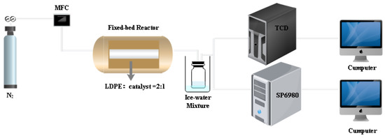 The pyrolysis experiment of waste plastics was performed in a fixed bed reactor, as pictured in Figure 8. Briefly, the device was composed of an electric heating tube furnace, a temperature-controlled system, a quartz reactor (ID = 50 mm, L = 440 mm), as well as a cooling system. In the typical pyrolysis run, the catalyst and the plastic sample were mixed at a mass ratio of 1:2 (the proportion of catalyst to plastic remained constant throughout the experiment). Each plastic sample weighed approximately 5 g, the exact catalyst and plastic sample mixture were placed in the quartz tube between two sections of quartz wool. The tubular furnace was first blown with nitrogen (100 mL/min) for about 30 min to remove air and then the system was heated at a rate of 15 °C/min to the desired temperature (450, 500, 550, 600 or 650 °C) and held for 0 min.