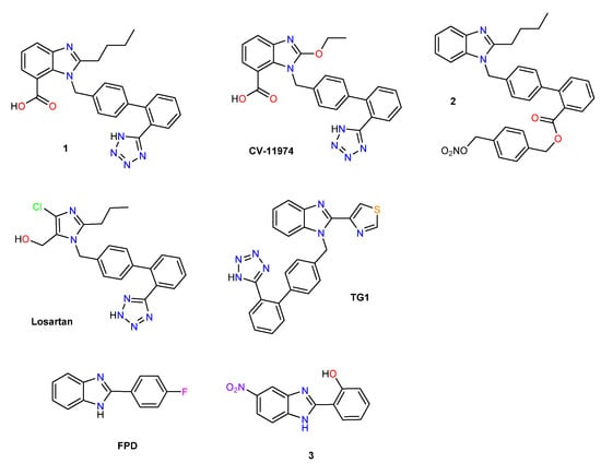 Sharma et al. have successfully synthesized a large variety of sartans by inserting different substituents at the 2-, 5-, and 6-positions in tetrazolylbiphenyl or carboxylbiphenyl modified benzimidazole [96,97]. In order to treat hypertension in the SHR model, Iqbal and colleagues created the new angiotensin II receptor blocker fluorophenyl benzimidazole (FPD) [98,99]. Estrada-Soto et al. have synthesized a series bearing a phenyl ring at the 2-position and varied substituents (–H, –CH3, –NO2, and –CF3) at the 5- and 6-positions [100]. Derivative 3, which has an IC50 value of 0.95 and a l M value of 2.01, has been shown to be the most effective compound among the former series [101].