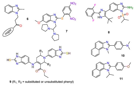 Taniguchi et al. have synthesized a variety of 2-aminobenzimidazole derivatives containing a wide variety of plausible substituents at the 1-position [126]. It has been reported that a structure-based design of 2-methyl-N-substituted benzimidazole containing a variety of sugar moieties (6) has strong anti-inflammatory action. This activity is dependent on the kind and linked-position of the sugar that is conjugated to the nucleus of the molecule [127].