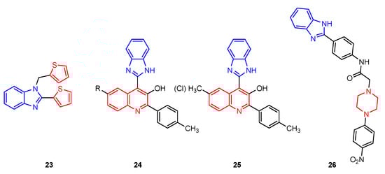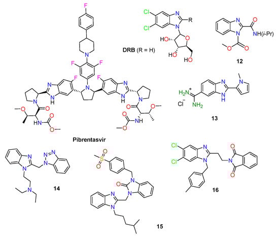 Several other classes of benzimidazole derivatives, such as coumarin conjugates [143,144] and benzimidazole diamides [145,146], were considered as potential lead hepatitis C virus NS5B (HCV NS5B). Currently, Pibrentasvir is an inhibitor of the HCV NS5A protein approved in US and Europe.