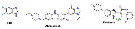 - Gianoncelli, A.; Cozza, G.; Orzeszko, A.; Meggio, F.; Kazimierczuk, Z.; Pinna, L.A. Tetraiodobenzimidazoles are potent inhibitors of protein kinase CK2. Bioorg. Med. Chem. 2009, 17, 7281–7289. [Google Scholar] [CrossRef]