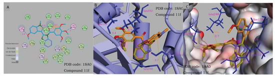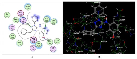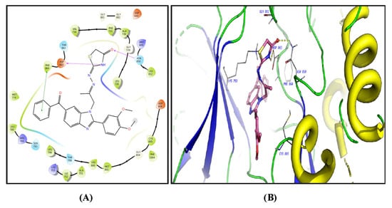 Azzam and colleagues created a variety of novel substituted 2-pyrimidylbenzothiazoles and evaluated their antiviral potency. These compounds either featured sulfonamide moiety or an amino group at the C2 of the pyrimidine ring [147]. The novel ring structure was synthesized via Michael addition reactions of guanidine or N-arylsulfonated guanidine with different ylidene benzothiazole derivatives. Plaque reduction tests were utilized to evaluate the antiviral activity of the newly synthesized compounds against HSV-1, CBV4, HAV HM 175, HCVcc genotype 4, and HAdV7. With significant IC50, CC50, and SI values, it was shown that 5 out of the 21 synthesized compounds exhibited greater viral reduction in the range of 70–90% when compared to Acyclovir. In the instance of CBV4, nine compounds have shown a reduction of more than 50%. When evaluated against HAV, seven of these newly developed drugs had similar outcomes, with just a couple showing 50% or more decreases against HCVcc genotype 4. Surprisingly, one compound, 2-((5-(benzo[d]thiazol-2-yl)-2-((phenylsulfonyl)methyl)pyrimidin-4-yl)amino)-1-(4-bromophenyl)ethan-1-one (Figure 8, A), showed extensive activity against all five tested viruses, suggesting that it may be effective as an antiviral medication. The examined compounds interacted hydrophobically with the active site of Phe 138 through the pyrimidine ring of ACV (Figure 8). The molecule had a single hydrogen-bonding at a distance of 3.84 Å between the amino acid residue Asp 102 and the sulfur atom of the benzothiazole ring.
