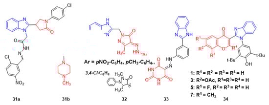 The importance of the inflammatory component in numerous diseased states such as Crohn’s disease [102], rheumatoid arthritis [103], asthma, multiple sclerosis [104], Alzheimer’s disease [105], carcinoma, psoriasis [106], diabetes mellitus [107], viral infections, control of inflammation, etc. has become of prime importance in recent years [108,109]. Inflammatory mediators such as interleukins 1–16 (IL-1 to IL-16), tumor necrosis factor-a (TNF-a), prostaglandins, histamine, chemokines (CXC, CC, and C subsets), leukotrienes, serotonin, plasma proteases, and colony stimulating factors are some of the most common and widely explored points for controlling inflammation (CSF) [110,111]. These mediators are generated through a number of distinct processes that include cyclooxygenases, caspases, and kinases such as mitogen activated protein kinase 38 (MAP38) [112], cyclin dependent kinases (CDK1 and CDK5) [113,114], serine threonine kinases (IKK1 and IKK2), c-Jun N-terminal kinase (JNK) [115], and interleukin receptor associated kina (TNFK) [116,117]. Benzimidazole nucleus replaced at 1-position with various heterocycles has proved to yield strong anti-inflammatory products [118].