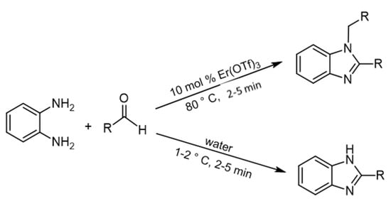 The use of Er(OTf)3 as a commercially available and easily recyclable catalyst promoted the synthesis of 1,2-disubstituted benzimidazoles [56]. Additionally, 2-substituted benzimidazoles were selectively obtained in high yield and short reaction times in water as solvent at 1–2 °C or at 80 °C (for electron-deficient aldehydes) (Scheme 4).