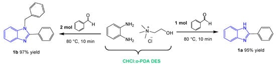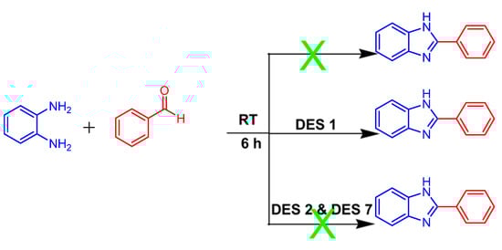 The remaining DESs showed no conversion of o-phenylenediamine to the corresponding benzimidazole derivative (Scheme 6).