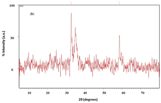 The XRD pattern of iron and zinc oxide NPs mycosynthesized from mushroom extract is shown in Figure 1. The diffraction patterns of the synthesized nanoparticles were recorded from 10° to 70°. The diffraction peaks of the synthesized material have a standard structure with several peaks, indicating iron at 2θ = 30.26°, 32.33°, 34.67°, 36.06°, 43.47°, and 46.36°, were obtained. The peaks were consistent with JCPDS card No.76-0958. Full Width at Half Maximum (FWHM) measurements for planes of reflection (220), (100), (320), (311), (400), and (211) were made. Zinc oxide NPs have a hexagonal crystalline structure and were confirmed through the peaks at 2θ values of 32.9°, 34.99°, 58.65°, 67.8° corresponding to the (100), (101), (110), and (200) crystalline planes. The average crystalline size of the iron nanoparticles was 16.8 nm, and the average crystalline size of zinc nanoparticles was 18.53 nm, as determined from the XRD patterns by applying Debye–Scherer’s formula [15].