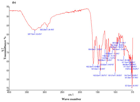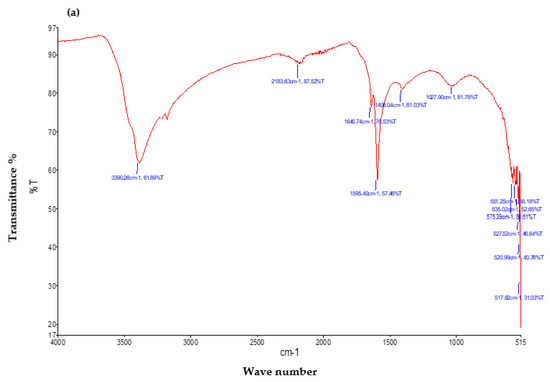 The FTIR analysis of the synthesized iron and zinc oxide nanoparticles is shown in Figure 2, which identified the possible biomolecules present in the mushroom extract. The FTIR spectra of iron NPs exhibited a peak at 3390.26 cm−1 allocated to N−H bond stretching of aliphatic primary amine, indicating the synthesis of Iron NPs. Additionally, peaks at 1408.04 cm−1 and 1640.74 cm−1 were attributed to the imine II and amine I bonds, respectively. Peaks at 1595.40 cm−1, 1027.90 cm−1 and 575.39 cm−1 were assigned to N=H, C−N stretching, and C−I stretching, respectively, in the biomolecules [16]. The peak at 3394 cm−1 is attributed to the strong O−H band of the alcohol. The vibrational modes of the strong N−O bond of nitro compounds and the C−H medium band of alkane compounds are represented by the absorption peaks of zinc NPs at 1549.76 cm−1 and 1407 cm−1, respectively. The peak at 669.07 cm−1 is attributed to the C−Br bond [17].