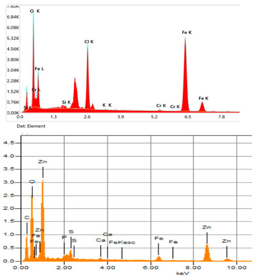 The existence of the element iron and zin oxide in the NPs can be identified by EDX analysis. The relative percentages of iron and oxygen in the mycosynthesized Fe nanoparticles (52.6% of iron and 30.5% oxygen) are similar to the theoretical expected stoichiometric masses. The relative percentage of zinc and oxygen in the mycosynthesized zinc nanoparticles (6.45% of zinc and 37.58% oxygen) are also similar to the expected stoichiometric masses. Three clear signals for Zn and one each for C, O, and P were observed. Other peaks for elements such as Fe, Ca, and S were also observed and are shown in Figure 4 [19].