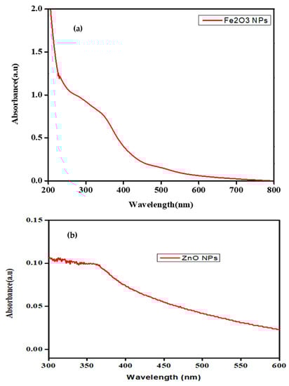 UV-Vis spectroscopic analysis of iron (a) and ZnO (b) nanoparticles.