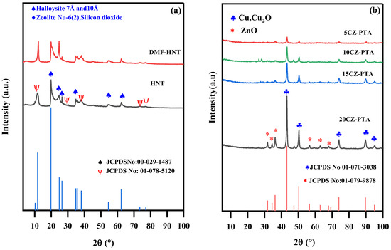 XRD pattern of the (a) HNT, modified-HNT, and (b) reduced CZ-PTA@HNT catalysts.