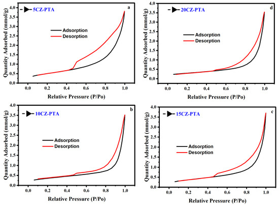 N2 adsorption-desorption isotherms of (a) 5CZ-PTA@HNT, (b) 10CZ-PTA@HNT (c) 10CZ-PTA@HNTand (d) 20CZ-PTA@HNT.