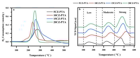 H2-TPR profiles of the calcined (a) and NH3-TPD- profile of reduced (b) CZ-PTA@HNT Catalyst.