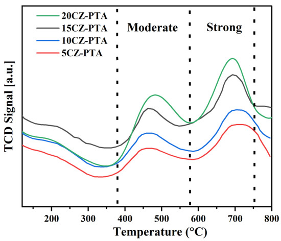 CO2 temperature-programmed desorption (CO2-TPD) profiles of the reduced CZ-PTA@HNT catalysts.