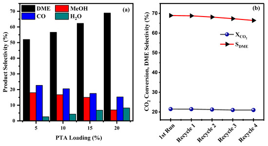 Moreover, methanol selectivity decreased with PTA loading while water selectivity increased (Figure 7a). As we know, the DME synthesis from CO2 hydrogenation contains two water-generating reactions, methanol dehydration and reverse water gas shift reaction; the water formed may cause severe deactivation to both active sites of the hybrid catalyst. In this regard, despite the increased selectivity towards the water with increased loading of PTA, the catalyst exhibited outstanding activity and resilience towards water produced during the methanol dehydration step. This can be attributed to the unique properties of the Brönsted acid sites present in PTA, as opposed to other solid acid catalysts with Lewis acid sites, such as γ-Al2O3, which tend to adsorb water, leading to a substantial decrease in the number of acid sites and, ultimately, catalyst deactivation [67,68].