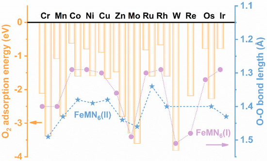 O2 adsorption energy (ΔE*O2) (yellow bar) and O−O bond length (purple spots and blue star). For each transition metal, the left yellow bar is for FeMN6 (I), and the right yellow bar is for FeMN6 (II).