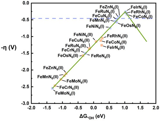 Volcano plot of −η related to ΔG*OH for FeMN6(I) and FeMN6(II).