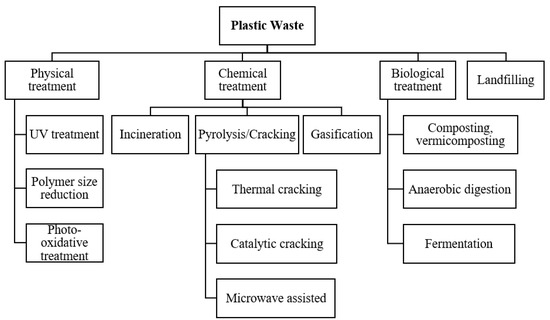 Today’s greatest challenges are the management of plastic waste and the reduction of environmental plastic pollution, especially keeping in mind the increasing demand for plastic products. Owing to the challenges present in the current scenario, there is a need to urgently switch the strategy of plastic handling from landfilling and incineration towards a more sustainable and environmentally friendly alternative. Plastic waste can be treated via different pathways as illustrated in Figure 1.