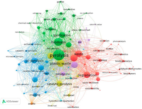 The network map was created by choosing keywords that appeared at least ten times. Out of 7971 total keywords, 418 matched the criteria and were grouped into eight major clusters. The keywords that have found most importance in the past three years include “plastic pyrolysis”, “catalytic pyrolysis”, “photocatalysis” and “gasification”. Although conversion of plastic waste to valuable products has been under investigation for a significant period, it wasn’t until 2015 to 2019 that major publications in the field of plastic waste pyrolysis and gasification showed the technique of pyrolysis being exploited to its full potential. However, gasification is still under research and is in its development stage in terms of parameter optimization and improved product yield. Much scope exists to improve the yield of liquid product obtained through catalytic pyrolysis by changing catalyst or optimizing process parameters in accordance with catalyst. Recently, research on advanced oxidation techniques, such as photodegradation using photocatalyst, has taken a leap and researchers are investigating and analysing its potential for obtaining valuable product.