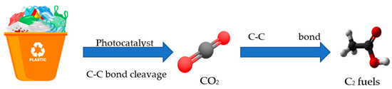 The mechanism of photocatalytic conversion of plastic waste can be found in Figure 4. Semiconductor photocatalysts typically feature a band structure and narrow band gap. If the photon energy absorbed by the semiconductor is higher than its band gap, the electrons may be stimulated from the valence band to the conduction band, leaving photoinduced holes on the valence band. Additionally, holes can oxidise water to ·OH, which then oxidises plastic to CO2. Furthermore, the reduction of electrons on the conduction band causes CO2 to be transformed into C2 fuels like acetic acid.