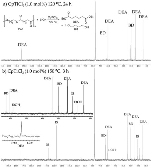 The reactions with PBA (500 mg scale, commercially available sample from Sigma-Aldrich, Mw = 12,000) instead of PEA were also conducted, and the results at 150 °C are summarized in Table 1. As observed in the reaction of PEA, the 13C NMR spectrum for the mixture after the reaction (obtained by removing ethanol under reduced pressure) at 120 °C for 24 h (CpTiCl3 1.0 mol%) showed that resonances ascribed to PBA clearly disappeared, and the corresponding resonances ascribed to DEA and 1,4-butane diol (BD) were solely observed without any other by-products (Figure 2a); only DEA and BD were observed on the GC chart []. Moreover, as shown in Figure 2b, a similar NMR spectrum was observed from the reaction mixture when the reaction was conducted at 150 °C for 3 h (run 7), and GC yield was higher than 99% []. It seems that the conversion of PBA to DEA may not be reached completion when the reaction was conducted with low catalyst loading (CpTiCl3 0.5 mol%, run 8), although no significant differences were observed in the 13C NMR spectrum of the reaction mixture (with complete conversion of PBA). As observed in the reactions with PEA, Cp*TiCl3 showed rather low catalyst performances under the same conditions (runs 9–11, Table 1).