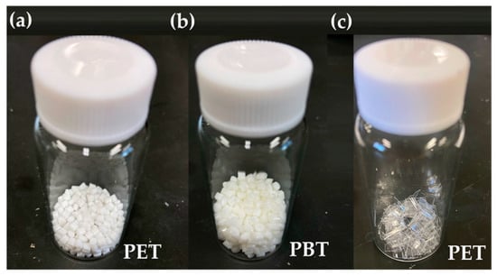 Samples for commercially available (a) poly(ethylene terephthalate) (PET), (b) poly(butylene phthalate) (PBT) pellets, and (c) PET sheets by cutting the drink PET bottle.