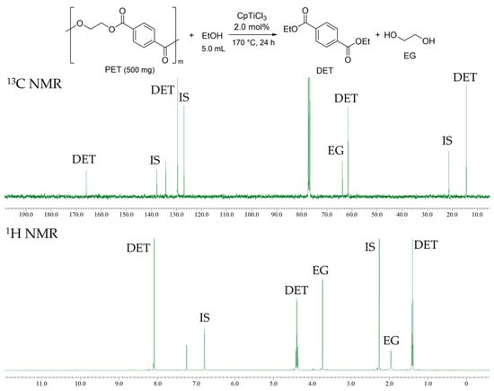 NMR spectra (in CDCl3 at 25 °C) for transesterification of PET with ethanol by Cp*TiCl3 (2.0 mol%). Conditions: PET sheets (from the bottle) 500 mg, ethanol 5.0 mL, 170 °C, 24 h (run 21).