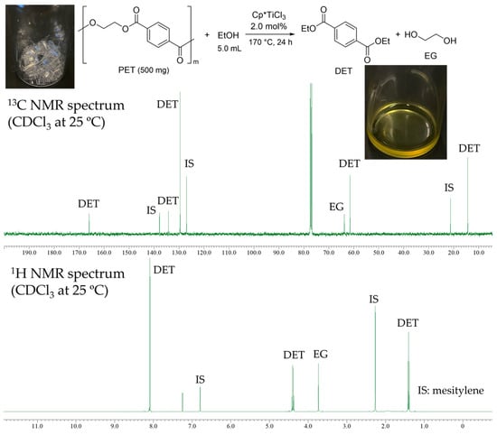 The results in the presence of Cp*TiCl3 conducted under similar conditions are also summarized in Table 2 (runs 17–21). As observed in the reaction by CpTiCl3, the complete conversions of PET were achieved even at 150 °C (run 17), although the GC yield was somewhat low compared to those conducted at 160 °C (run 19) and 170 °C (run 20) with higher Ti loading (2.0 mol%). The reaction with the PET sheets (prepared from the used bottle) also proceeded at 170 °C to afford both DET and EG exclusively (97% isolated yield, run 21). The resultant reaction mixture showed the pale yellow viscous liquid (photo in Figure 6, probably due to contamination of residual species formed from Cp*TiCl3), and both the 1H and the 13C NMR spectra showed that resonances ascribed to DET and EG were observed without resonances ascribed to the by-products.