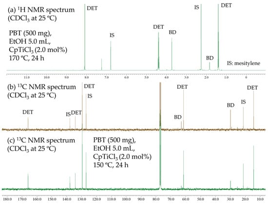 The transesterifications (depolymerizations) of the PBT pellet (Figure 3b, commercially available resin, Mn = 32,000) with ethanol were also conducted under similar conditions. As shown in Figure 7a,b, the NMR spectra after the reaction (170 °C, 24 h) showed resonances ascribed to DET and BD exclusively, and the other resonances were not observed. Moreover, the 13C NMR spectrum of the reaction mixture conducted at 150 °C showed similar to those conducted at 170 °C (Figure 7c). In both cases, the GC charts showed the two products (DET and BD) solely. Although the GC yields of DET were ca. 80% (79, 82%, at 150 °C and 170 °C, respectively), this could be refined after isolation of the DET and/or another analysis method. These results also indicate that Cp’TiCl3 enabled the depolymerization of PBT by transesterification with ethanol.
